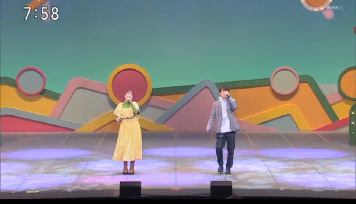 まやお姉さんが歌い出すとゆういちろうお兄さんも合流しました。ゆういちろうお兄さんも薄いグレー(薄い紫色かも?)のチェックのジャケット+グリーンのタータンチェックのパンツにお召替え。