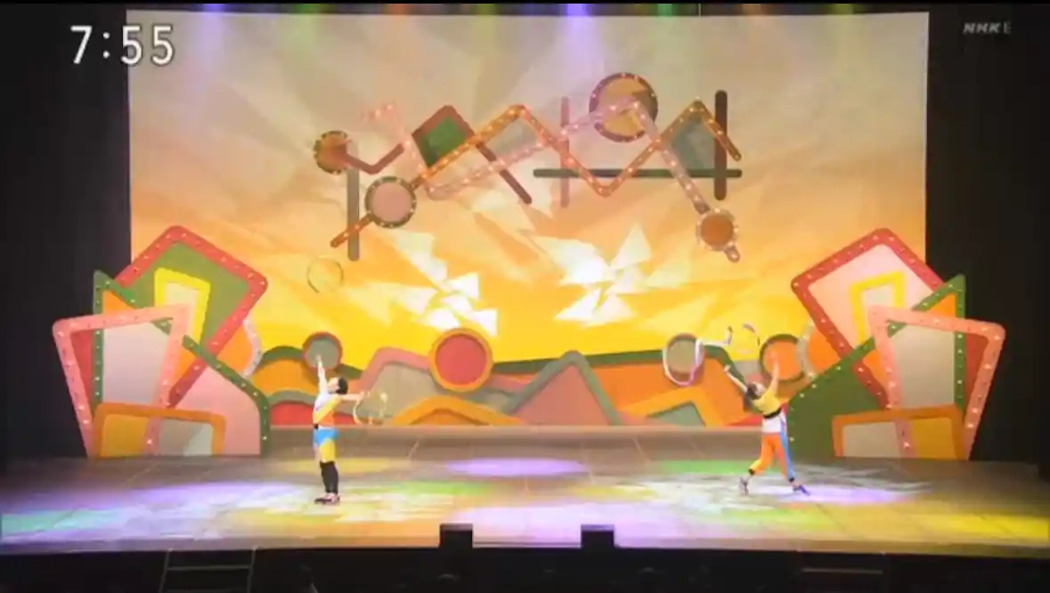 今日のゆういちろうお兄さんは黄色いタートルネックに赤チェックのロング丈のシャツをはおりボトムも赤、シューズは黄色、髪の色はかなり明るめの茶色。まやお姉さんは赤のタートルに白黒チェックのベスト、紺色のガウチョパンツ、赤のスニーカー。ふたりともカジュアル寄りの衣装です。