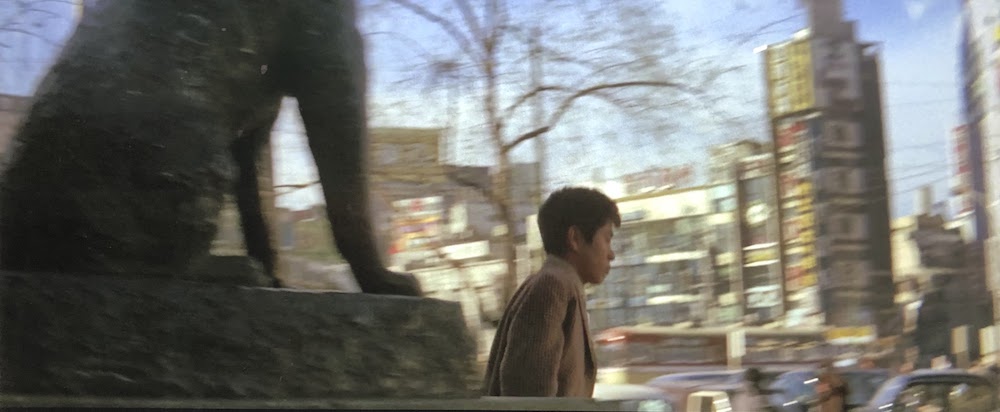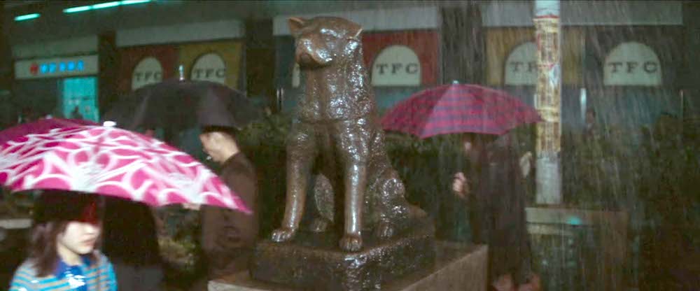 冒頭渋谷の街からハチ公前広場までが映し出される。渋谷駅前交差点とハチ公前広場。ハチ公は広場内の地下商店街入口の四角い屋根の上にみえる。