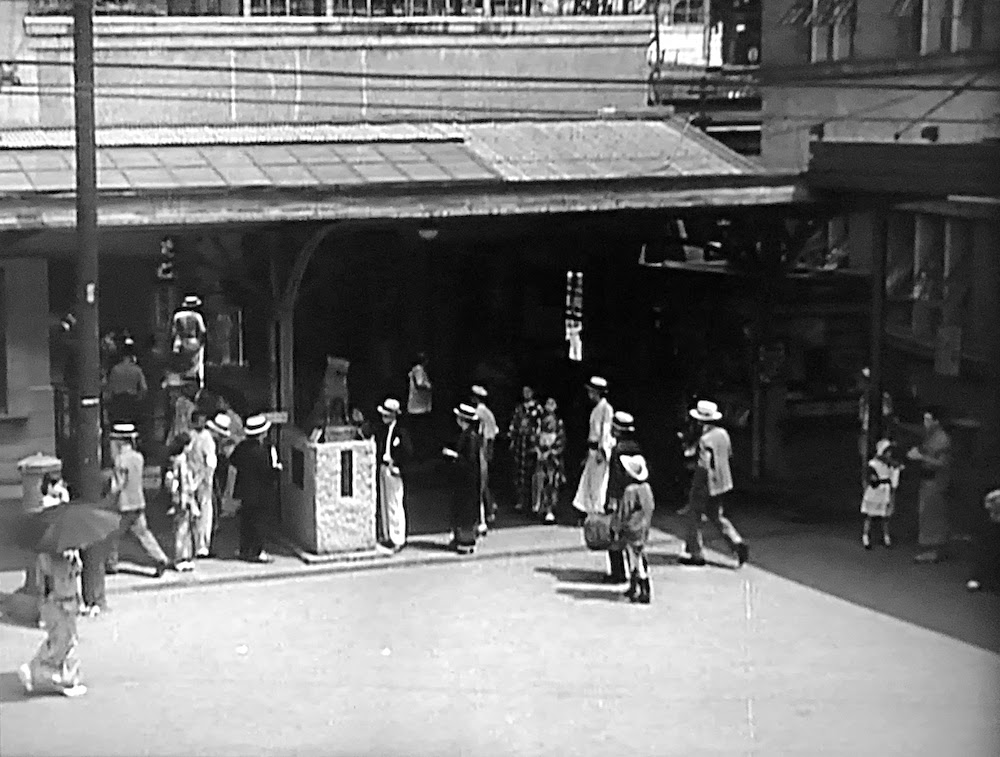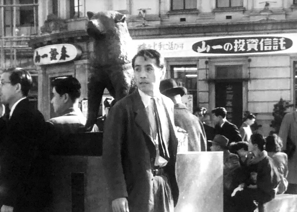上京した陽洋先生(丸山定夫)と於菟(伊東薫)は渋谷に出る。渋谷駅前、ハチ公像のまわりに群がる人々。