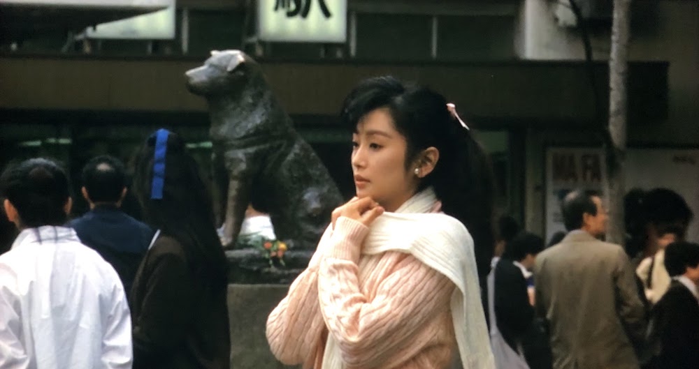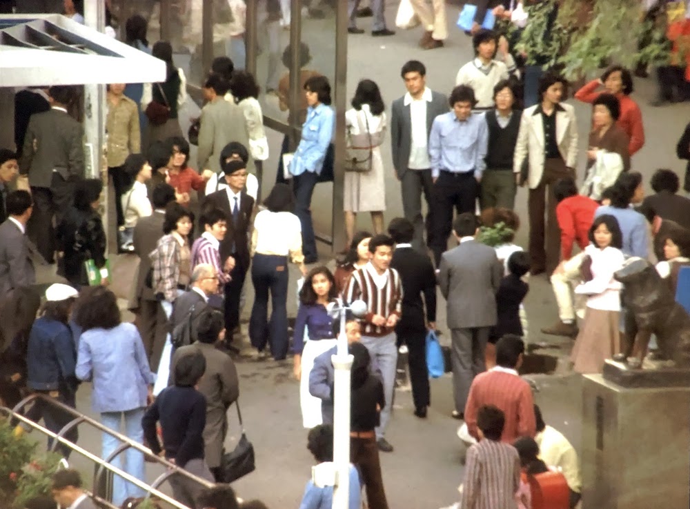 典子(秋吉久美子)の行動を怪しんだ原田(高橋英樹)はひそかに典子の後をつける。典子が歩いているのは渋谷ハチ公前広場。右端にハチ公像が見える。