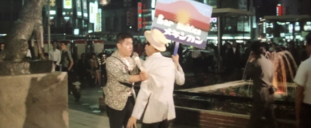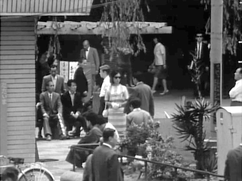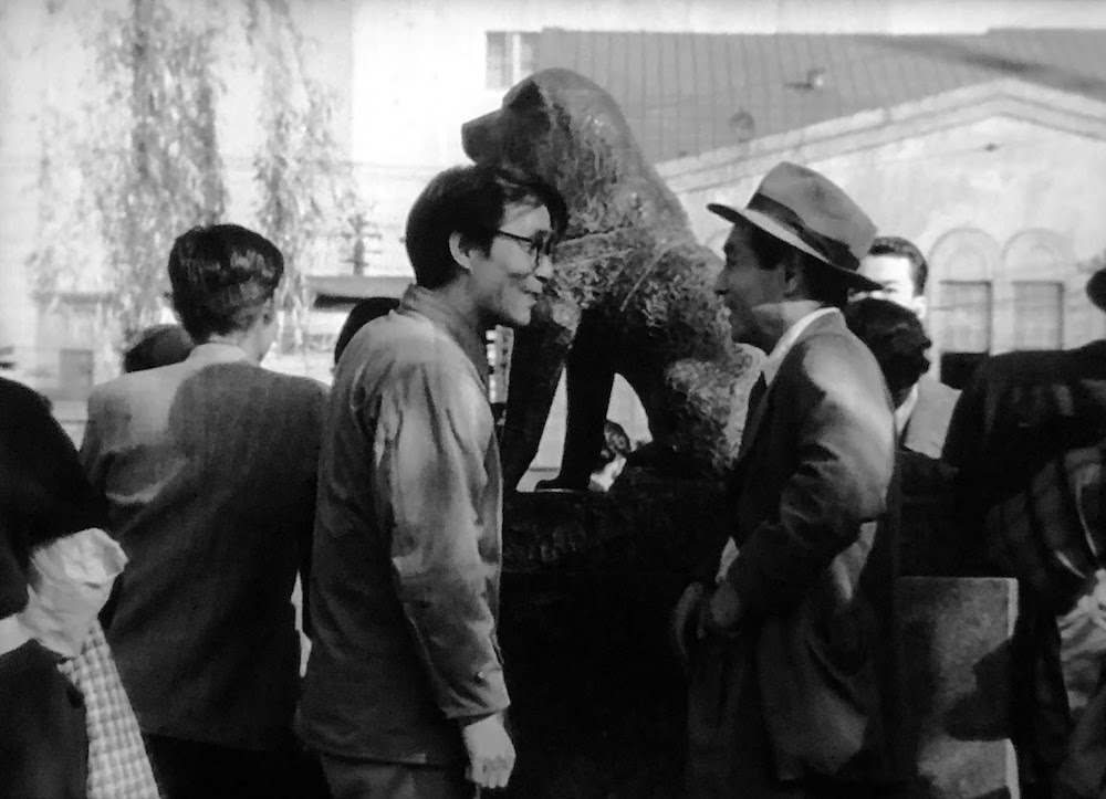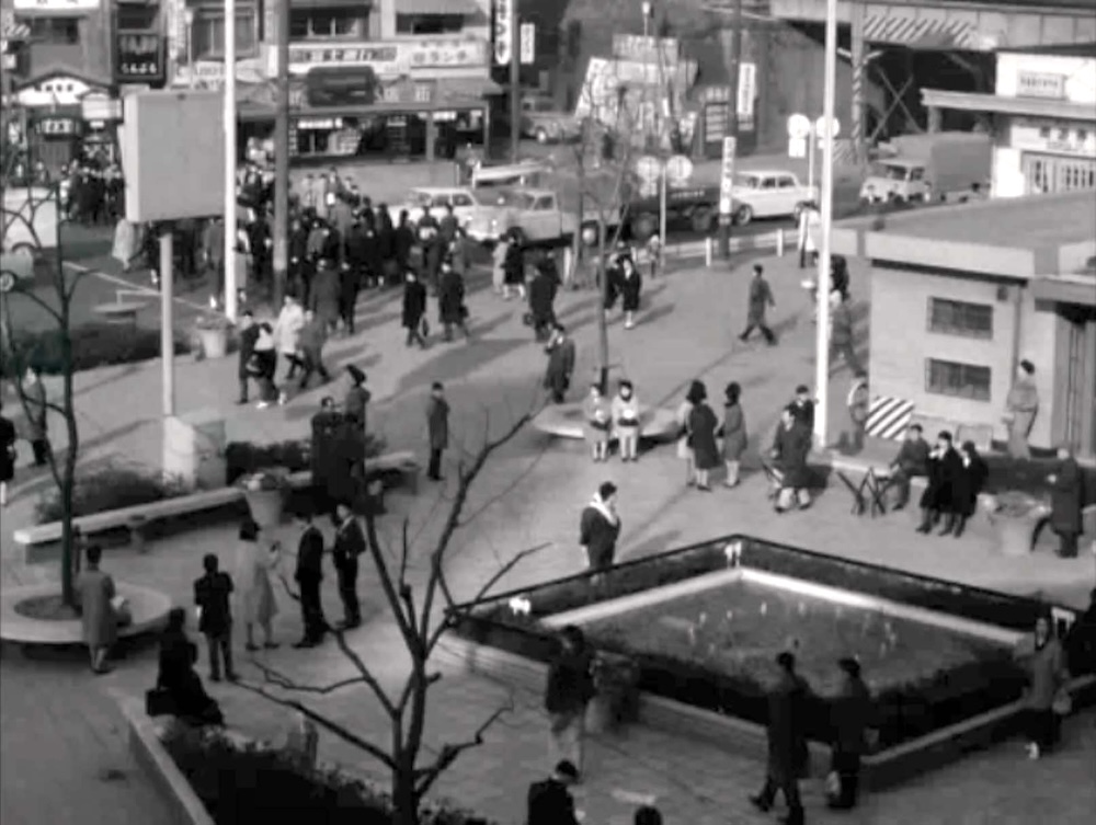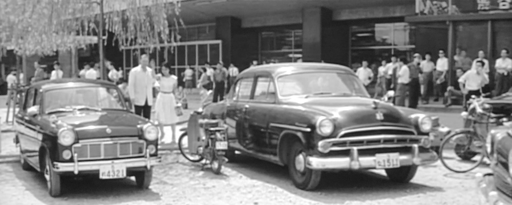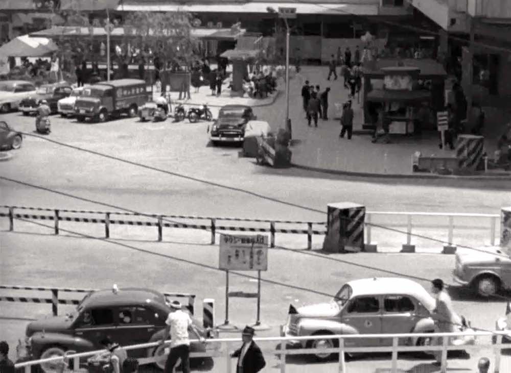 外国人の客を連れたユキ(千代侑子)と車に乗った明(川地民夫)と勝(郷鍈治)がハチ公広場で落ち合うシーン。