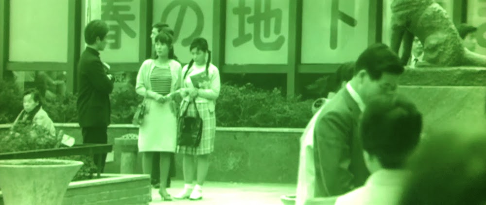 吉岡務(河原崎長一郎)の回想シーンには緑のフィルターがかかる。吉岡が森田ミツ(小林トシ江)と待ち合わせをした時の渋谷駅前のシーン。右にハチ公像。