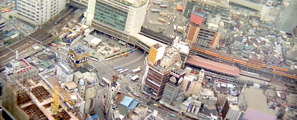 渋谷駅、渋谷駅前交差点、ハチ公前広場、背後の「東急百貨店東横店」。画面左手に山手線が見える。