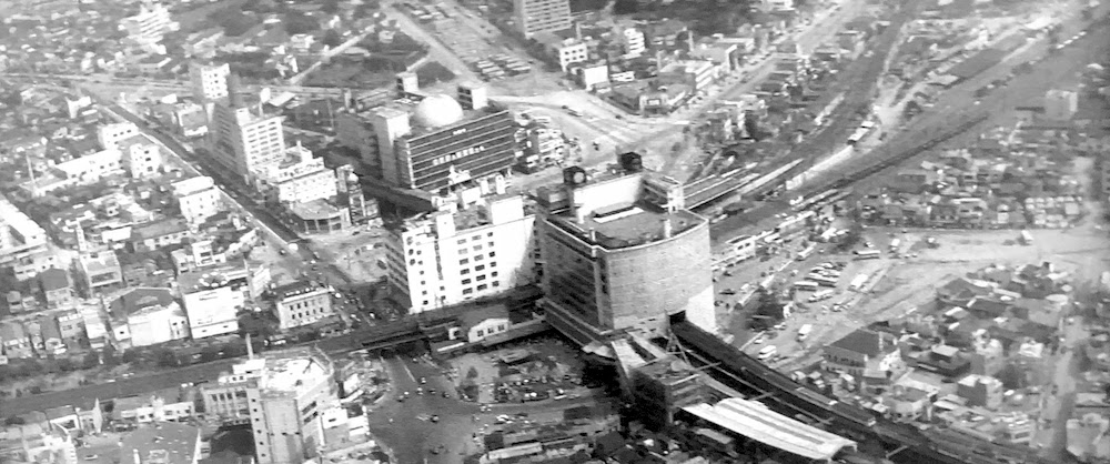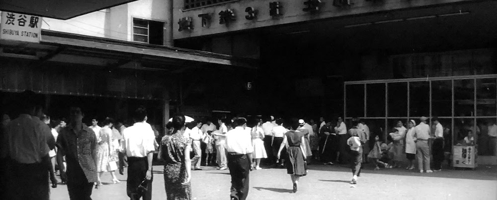冒頭、石野貞一郎(小林桂樹)が通勤で使う渋谷駅の空撮が映る。左右に横切るのが山手線、右下に伸びるのが京王井の頭線等。手前がハチ公前広場と駅前交差点。中央に「東急百貨店東横店」、その背後に「東急文化会館」が映る。