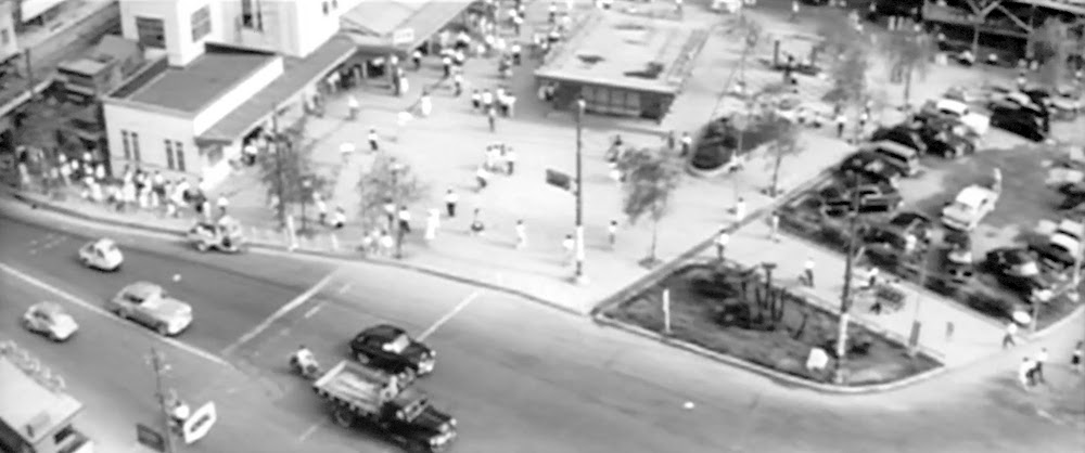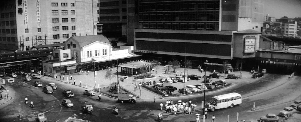 オープニングに渋谷の街が映る。渋谷駅前交差点。左手にハチ公前広場、背後に「東急百貨店東横店」と井の頭線とJRの連絡通路。右手に「大林百貨店」(現「渋谷駅前ビル」「大外ビル」道玄坂2-3)。