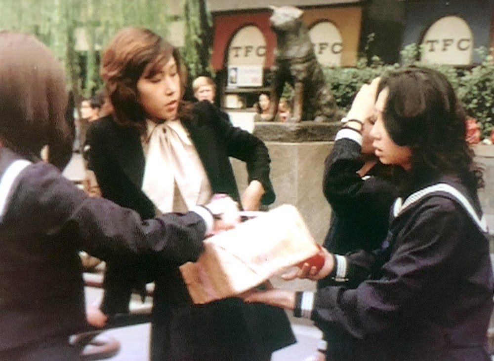 典子(秋吉久美子)の行動を怪しんだ原田(高橋英樹)はひそかに典子の後をつける。典子が歩いているのは渋谷ハチ公前広場。右端にハチ公像が見える。