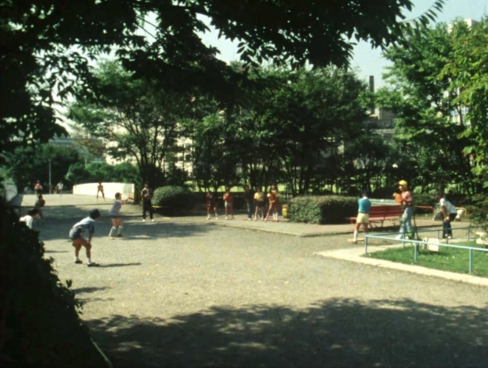 組員が遊んでいる公園は「宮下公園」(現「MIYASHITA PARK」神宮前6-20-10)。左遠方に「岸記念体育館」(2024年1月現在代々木公園拡張工事中 / 神南1-1-1)が見える。