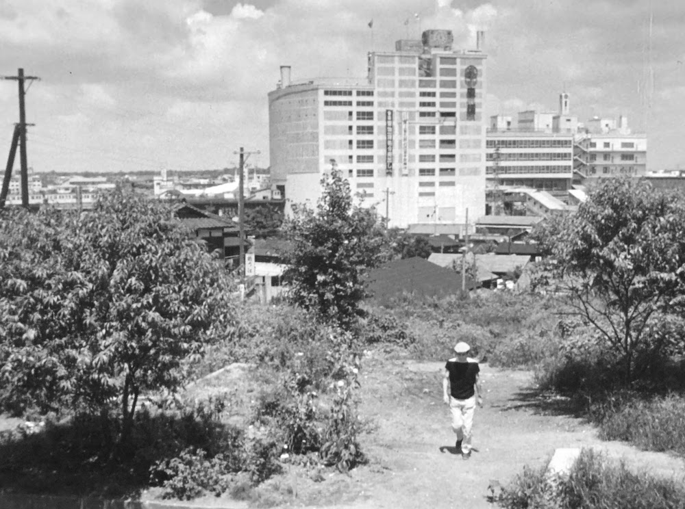 姫野宅から渋谷駅と反対方向の風景。右側のピンクのビルは「加藤ビル」(現「加藤・大谷ビル」桜丘町25-17)、中央「ナポリ スチーム」の看板は「トルコ ナポリ」(現「ニッポンレンタカー渋谷駅南口営業所」桜丘町25-5)、その後方「東急不動産」は「東急本社ビル」(現「渋谷セルリアンタワー」桜丘町26-1)。