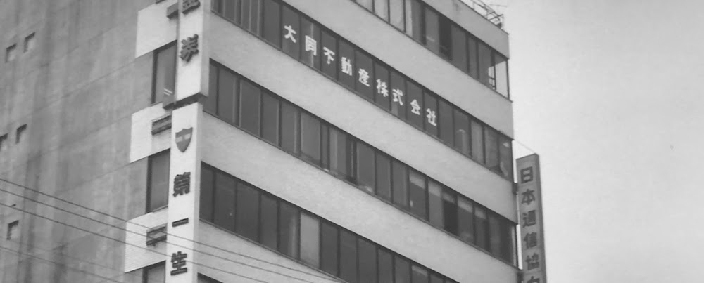 右側端の建物は「東急本社ビル」(現「セルリアンタワー」桜丘町26-1)。「東洋信託銀行」は現「日本経済大学大学院 246ホール」(桜丘町25-16)。「山叶證券」があるのは「加藤ビル」(現存 / 桜丘町25-17)。