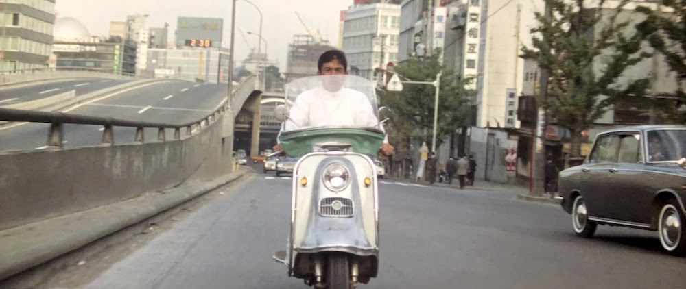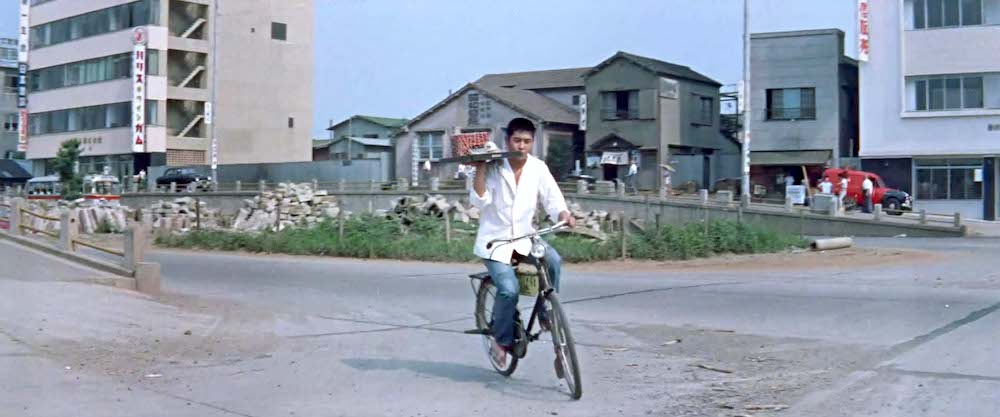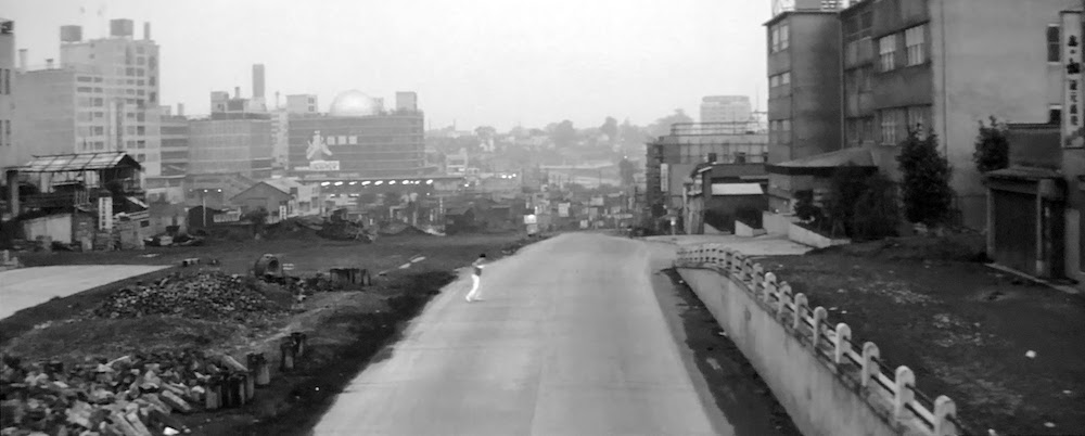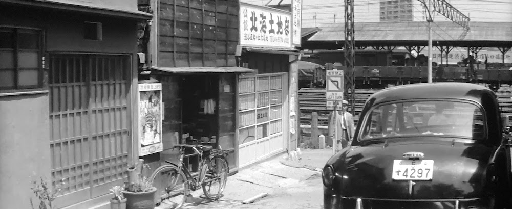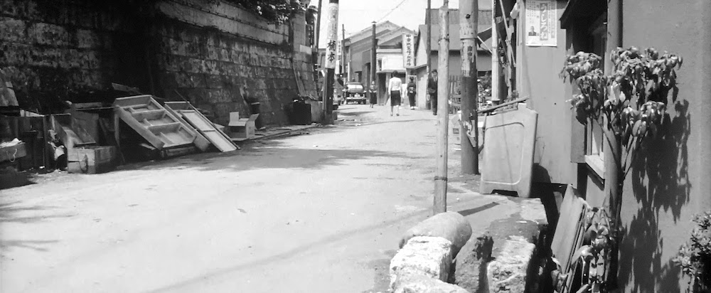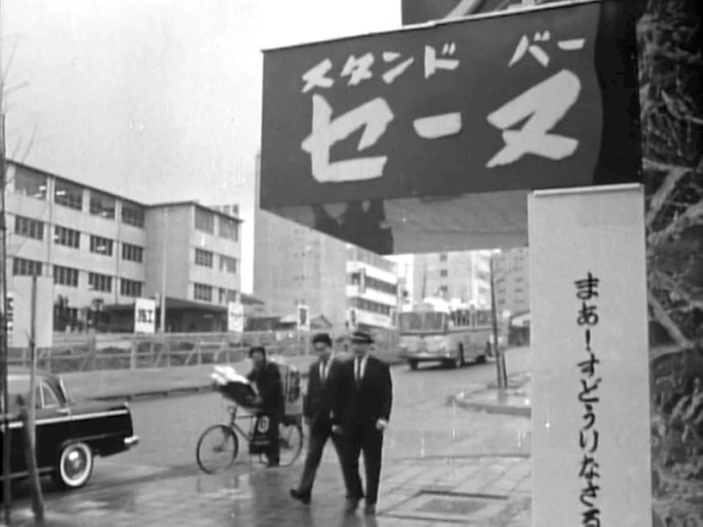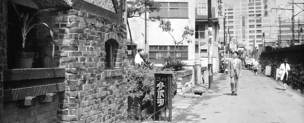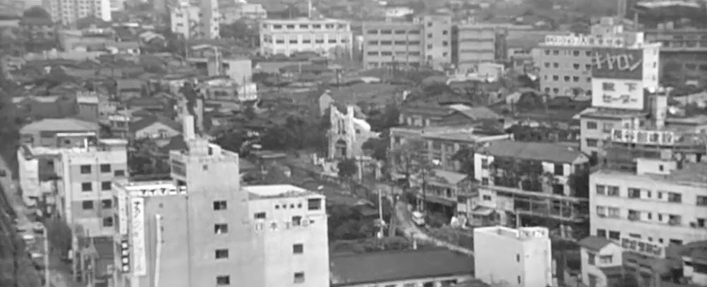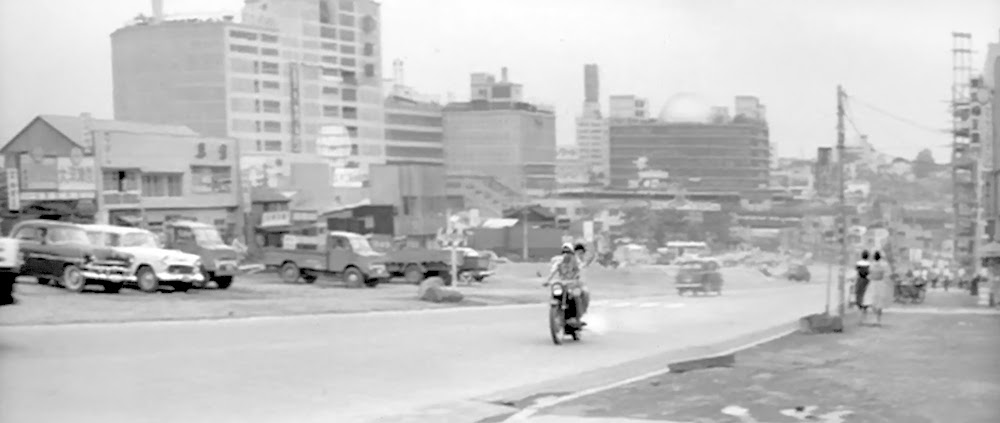 首都高3号線建設前の玉川通りを出前で走る由良二郎(和田浩治)。南平台交差点あたり。背後の「ハリスチウインガム」「第一生命」等の看板があるのは「奥の松ビル」(現在「カフェ・ド・クリエ」がある「JMFビル渋谷02」桜丘町31-15)。