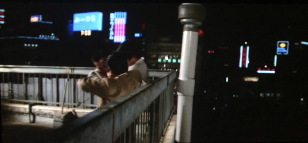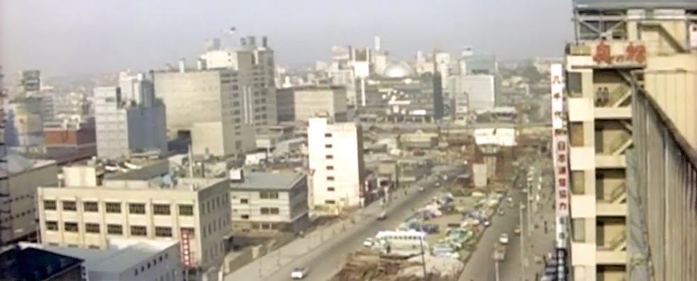 遠方に見える「山一證券」(渋谷2-22-8名取ビル、現存)、「富士フィルム」(現「渋谷ストリーム」前、渋谷3-18叶ビル)の看板の位置関係、このビルの下を山手線(銀座線かとおもったが当時「カナリヤ色」だった山手線のようだ)が走っていることから、桜丘町の山手線沿い、渋谷区桜丘町3あたりと推定した。さらに当時その近辺に高いビルは「第二岡崎ビル」(桜丘口地区再開発事業区域内、現存せず)だけなので、同ビル屋上と推定する。なおマンションの外観のシーンは同ビルのものではなかった。