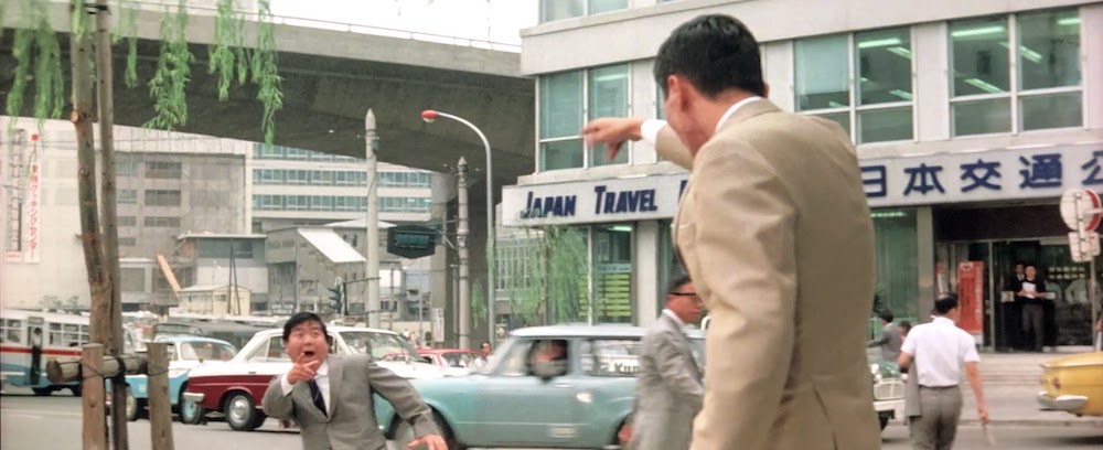 質屋に着物を入れに来た花川戸大五郎(ハナ肇)の妻若子(春川ますみ)は高級クラブ「アンブレラ」のマネージャー植村(植木等)からホステスに勧誘される。質屋から「アンブレラ」に向かうシーン。