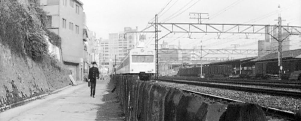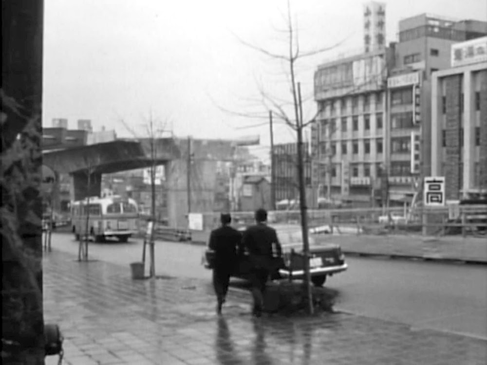 左が山手線。「日本生命」の看板は「日本生命渋谷支店」、「火災」の看板は「住友海上火災渋谷支店」、舞台となる「バー チドリ」は実在の店舗。いずれも桜丘町の山手線沿い道に面した一画(桜丘町3)。当時の住宅地図より特定。再開発に伴い現在この道は廃道となり、沿道の街区を含め「渋谷サクラステージ」セントラルビルの一部となっている。