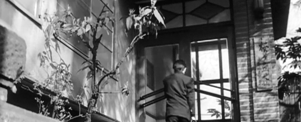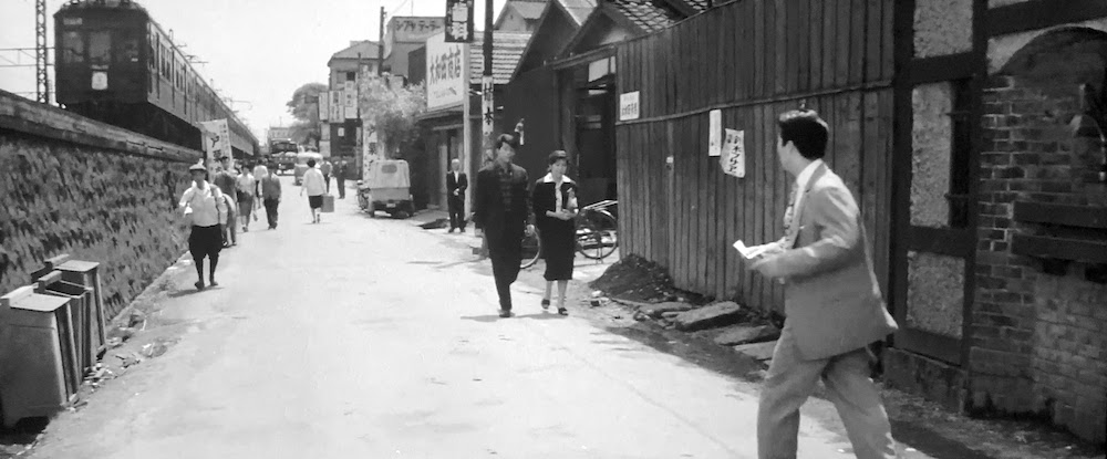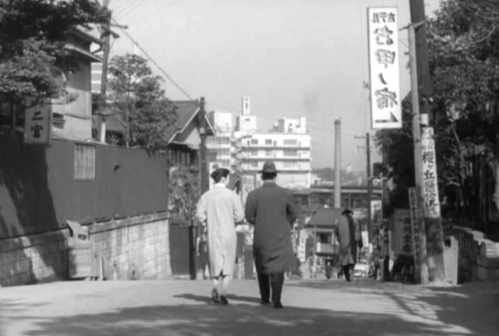 朝高原桐子(司葉子)が父親(笠智衆)と家を出るシーン。桜丘町から渋谷駅方面へ下る坂沿い。左側の「割烹二宮」は現「二宮ビル」(桜丘町18-4)、右側下の「旅館京香」は現「NKG東京第2ビル」(桜丘町15-15)、裏文字になっている「ホテルお甲ノ宿」や「櫻ケ丘醫院」はこの道から右手に少し入った桜丘8-18あたりにあり、現在渋谷駅桜丘口地区第一種市街地再開発事業が施工中。なお高原家の居間の窓からは「東急百貨店東横店」が見えている。
