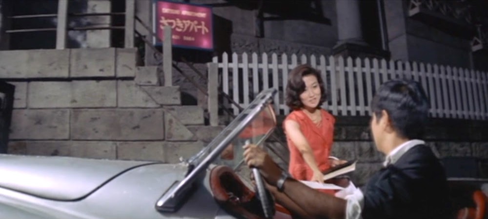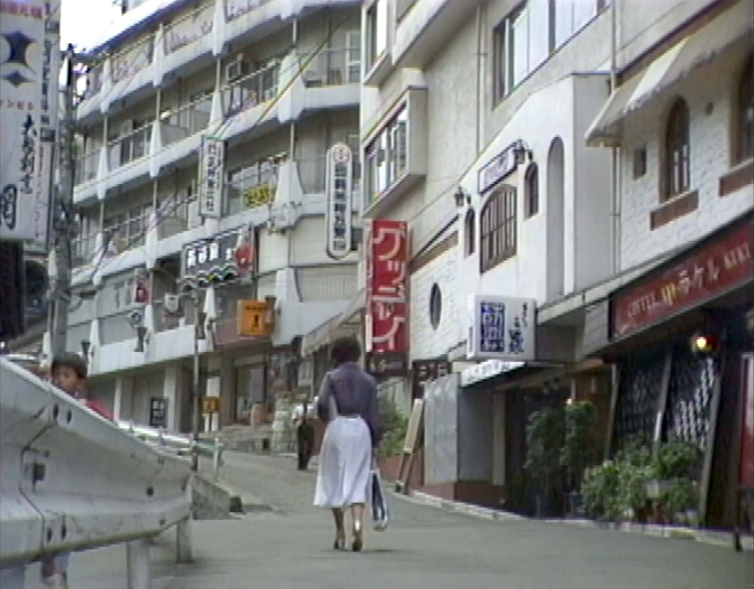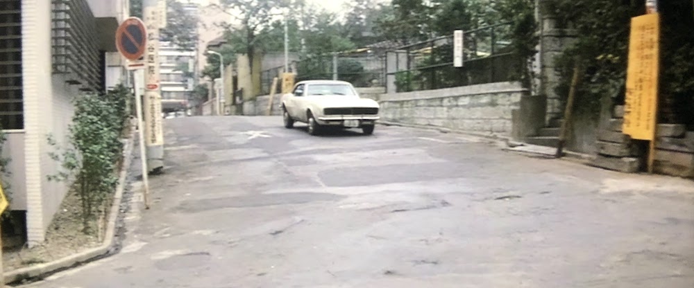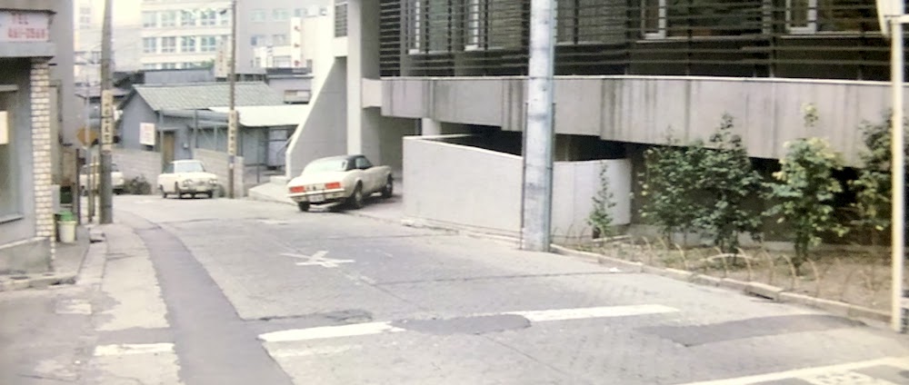 バー「アンコール」のホステス初枝(渡規子)がお得意様の画家、桃山豪(安部徹)とドライブに出る様子を同じアパートに住むバーのママが窓から見ているシーン。手前の電柱の左側の店舗は電柱の陰に隠れた看板から「三樹園社」(現「セルリアンタワー」桜丘町26-1)と判読できることから、撮影地点は「旅館桜丘会館」(現「ビジョナリーアーツ」桜丘町23-18)と特定。