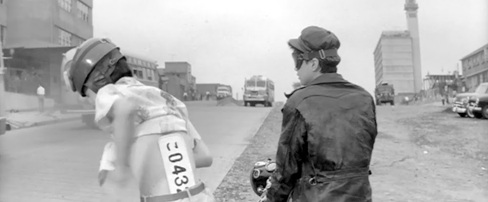 健(赤木圭一郎)のもとにバイクでかけつけたバッタ(小沢真好)とダダ公(仙頭哲)。盗品のバイクのナンバーをつけかえるシーン。