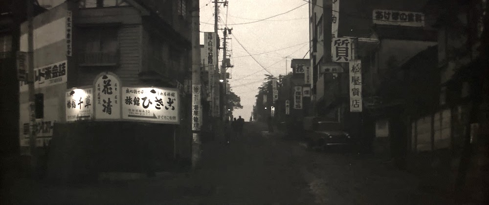 場所は桜丘町。右の「松屋質店」は現「曙ビル」(桜丘町16-2)。左の看板にある「旅館ひさご」は現「渋谷ジョンソンビル」(桜丘町17-12)、「旅館千草」は再開発に伴い「渋谷サクラステージ」SAKURAテラス(桜丘町3-20)となった。