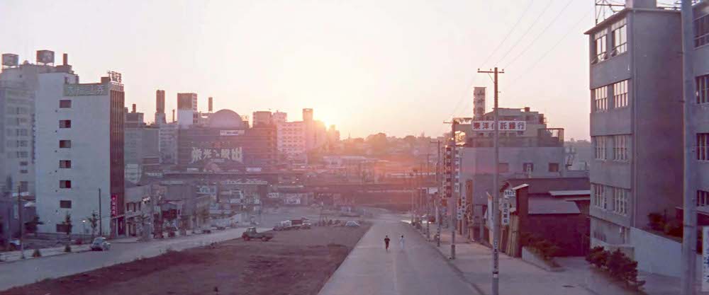 これはコニイが空き地になった丘を通り自宅に向かうシーン。コニイのアパートがあるのは桜丘町。周辺の道の形状や看板から「旅館桜丘会館」(現「ビジョナリーアーツ」桜丘町23-18)と特定。