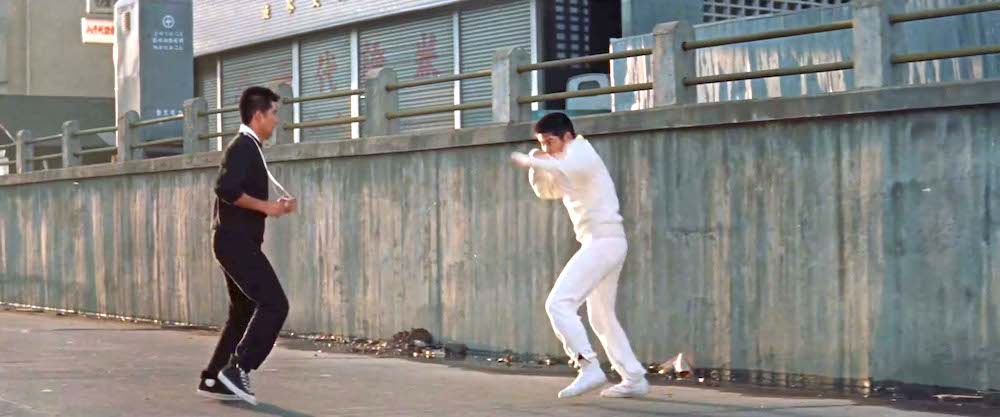 首都高3号線建設前の玉川通りでシャドウボクシングをする由良二郎(和田浩治)と城木喬二郎(葉山良二)。背後の「八千代証券」がある建物は「奥の松ビル」(現在「カフェ・ド・クリエ」がある「JMFビル渋谷02」桜丘町31-15)。車道と歩道の段差は現在もそのまま。