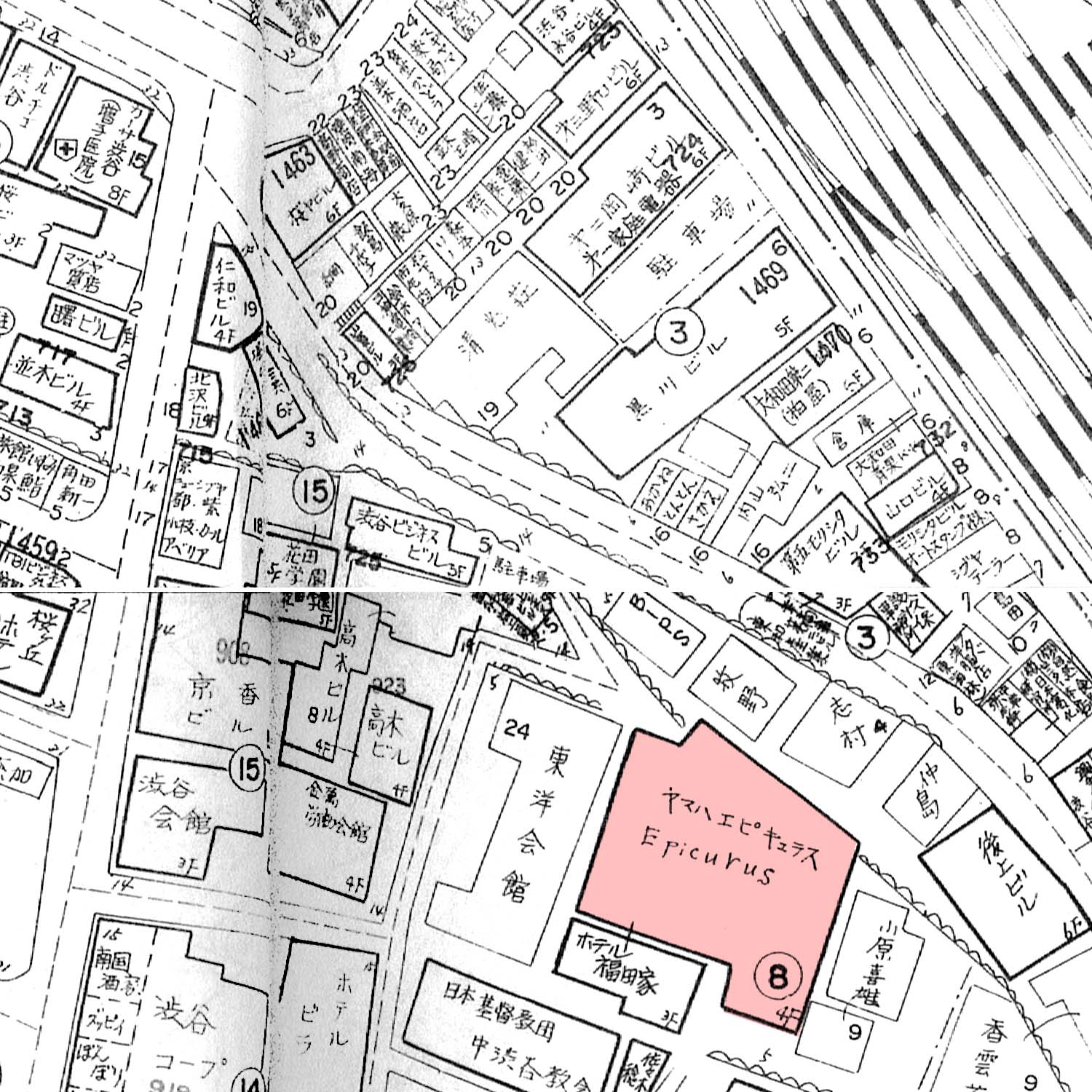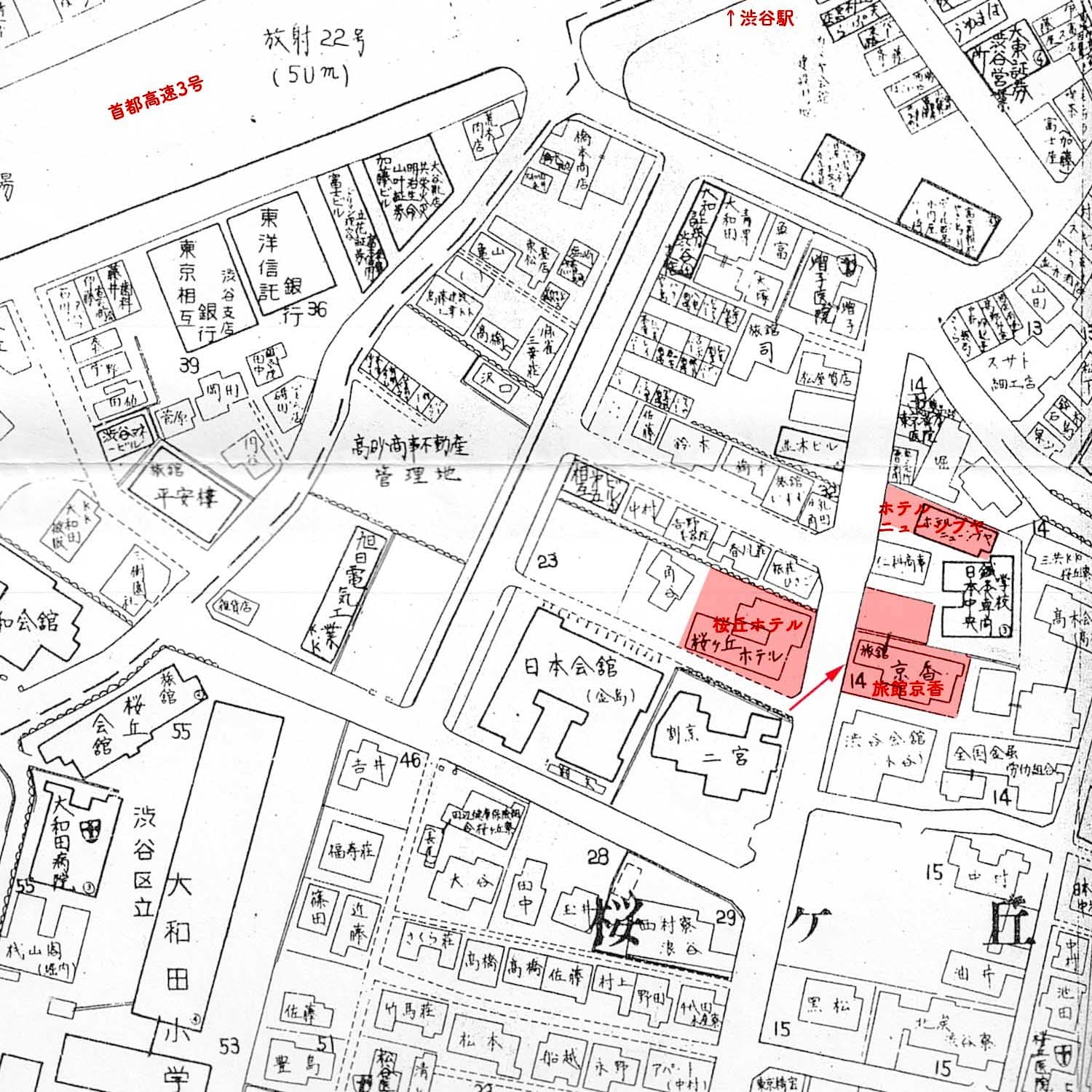 「桜丘ホテル」は現「法学館ビル」(桜丘町17-5)。向かいの「旅館京香」は現在「ルノアール」がある「NKG東京第2ビル」(桜丘町15-15)。