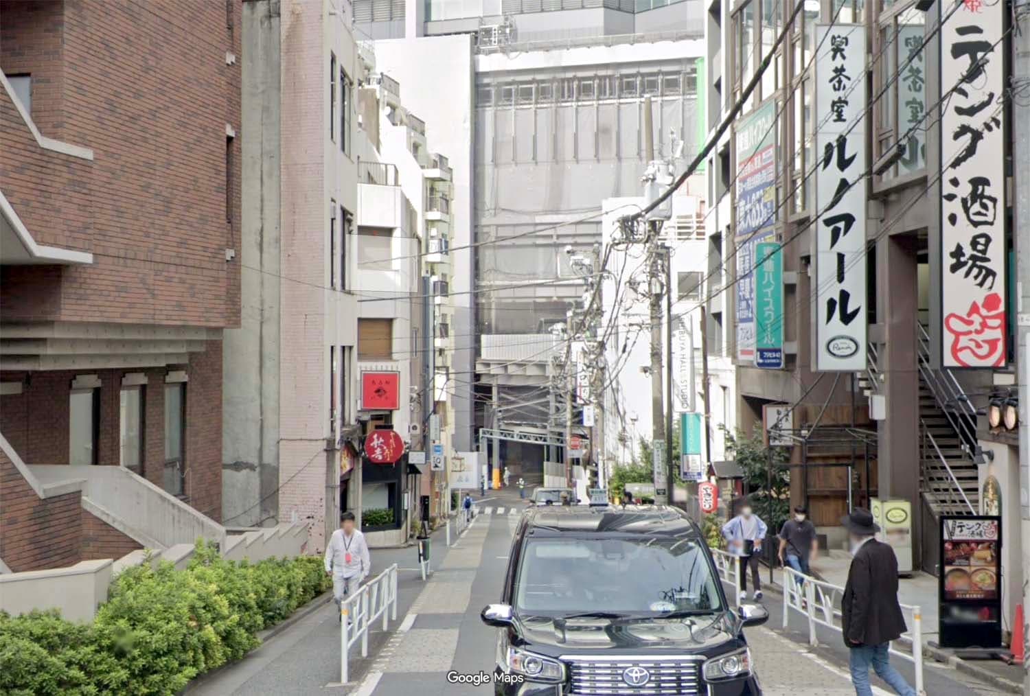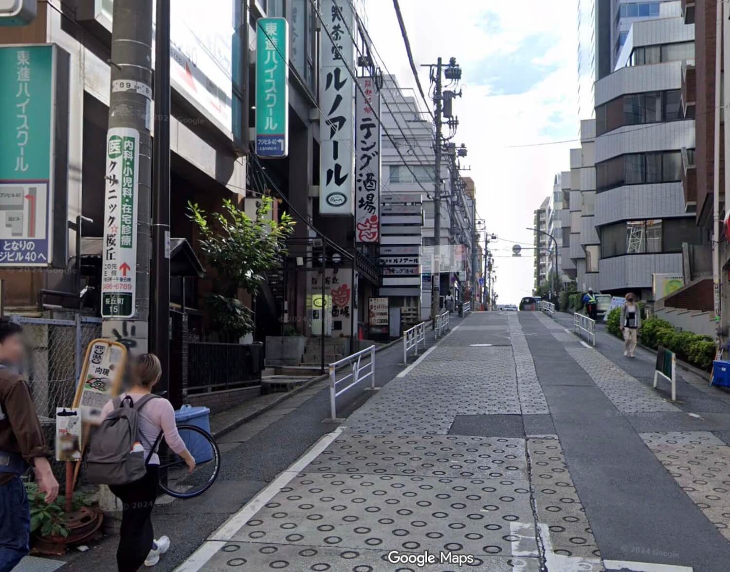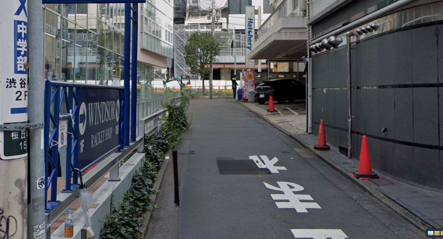 道と鉄道、「東急百貨店東横店」との位置関係から桜丘町の山手線沿いの道と推定し、2009年時点のGoogleストリートビューに画像中のビルがあることを確認、隣接地に建っている「桜ヶ丘平井ビル」(現存)の住所、桜丘町4-24付近であると特定した。