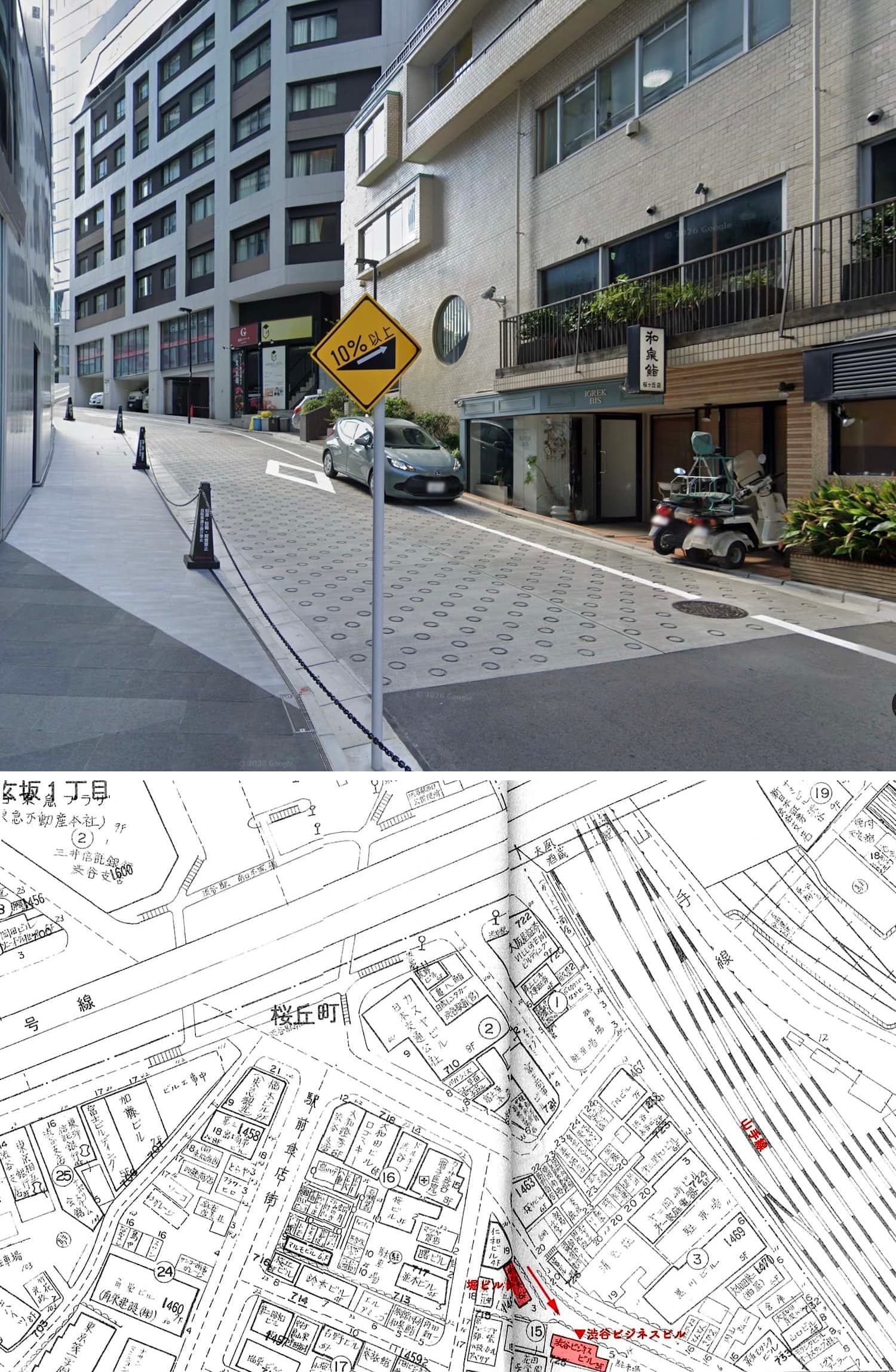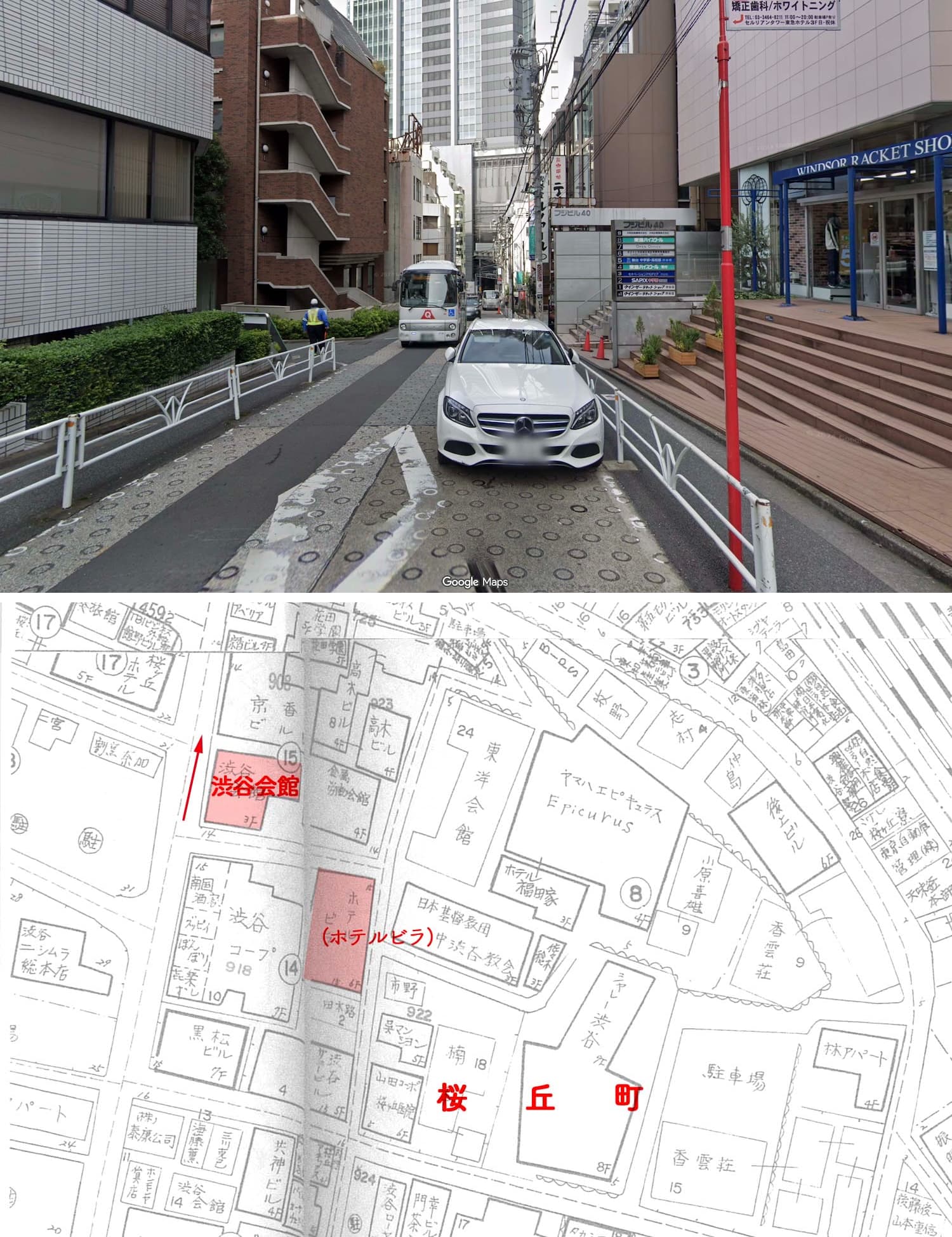 1枚目黄色い看板に「桜ヶ丘町会」とあることからまず桜丘町と推定。次に電柱の看板「松谷医院」の位置を「日本医学百年史」(1957)と当時の住宅地図から確認し、その周囲で2枚目のように右折すると下り坂になる交差点を探した。その結果2枚目のように外壁が段々になった建物に似た建物「安達会館」を発見。さらに2枚目の坂の遠方に見える建物は渋谷駅西口交差点に面した「第一カスヤビル」(現「渋谷サクラステージ」桜丘町2-9)であることをGoogleストリートビューの過去の画像から特定、位置関係から「安達会館」と確定した。