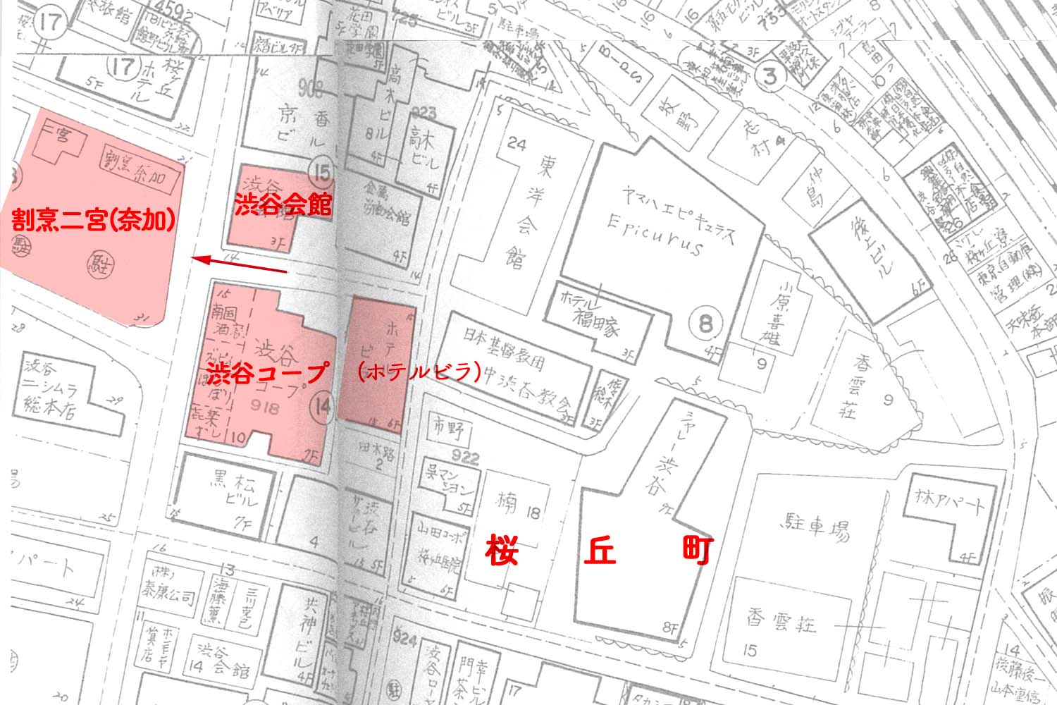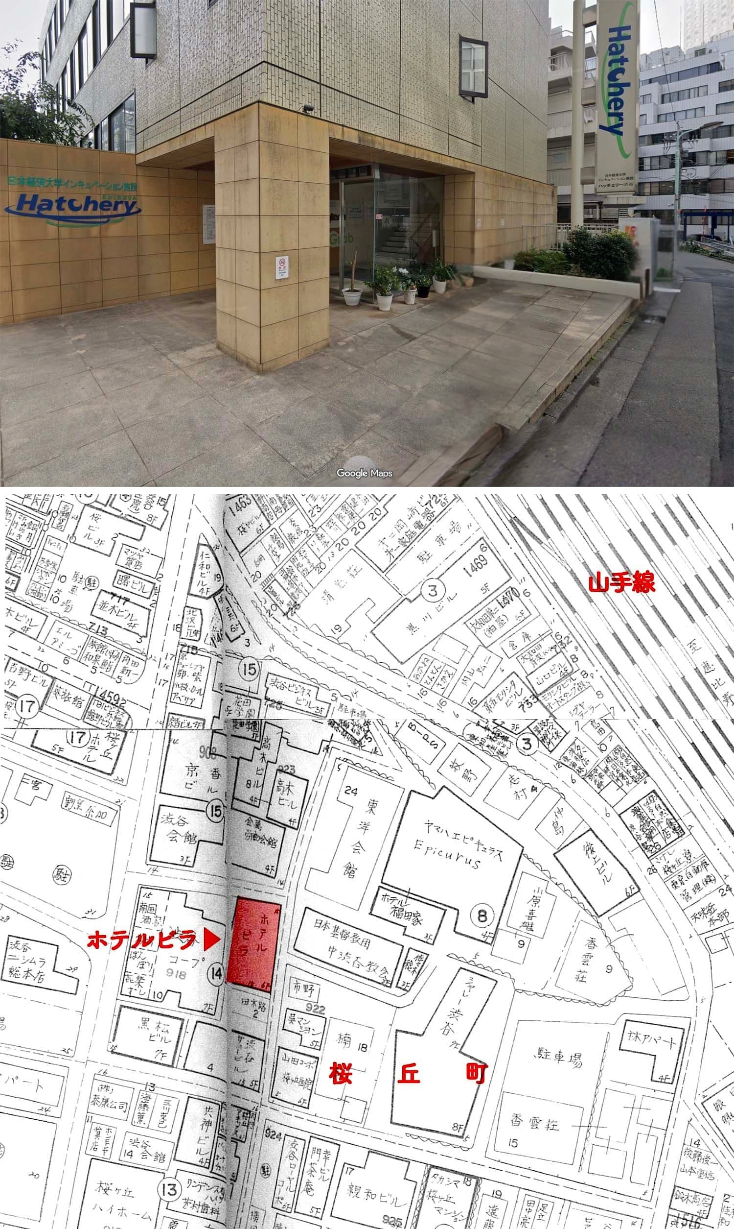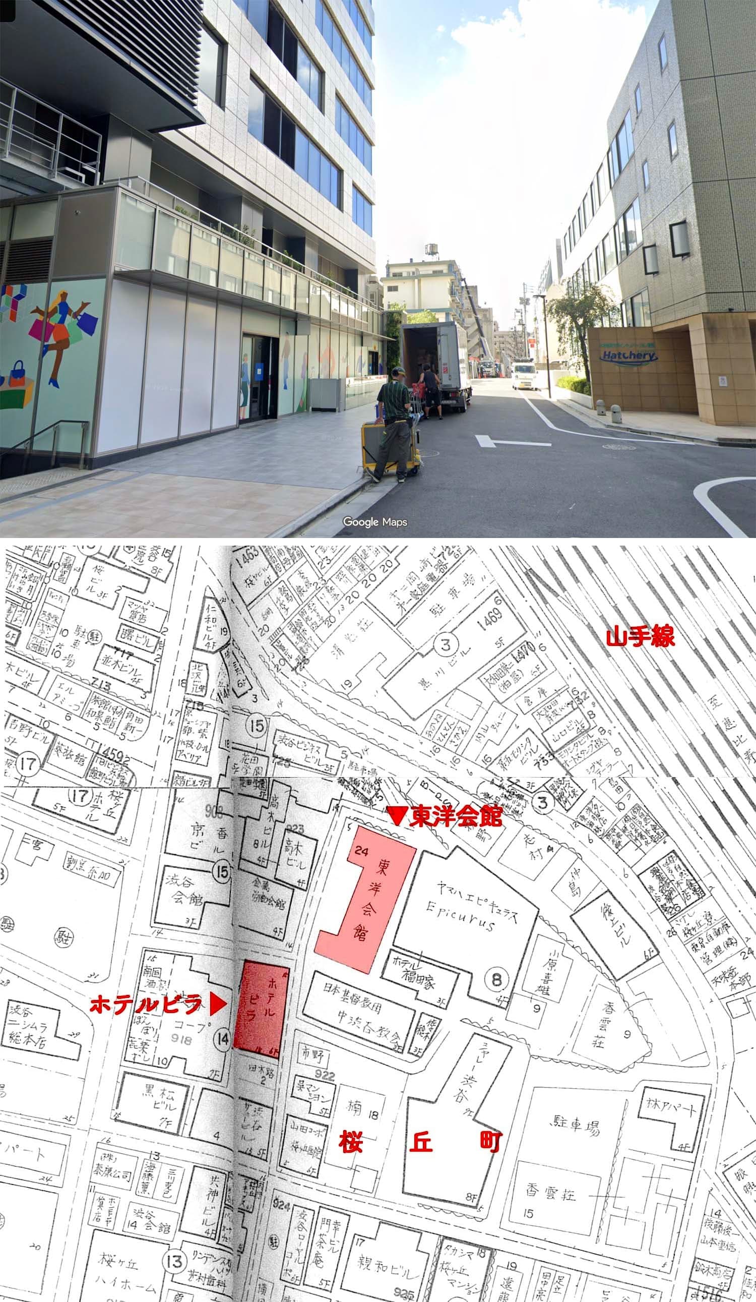 右側はアパート「渋谷会館」(現在ウインザーラケットショップがある「フジビル40」桜丘町15-14)。二人が利用していた「ホテルビラ」からの動線で場所を特定。