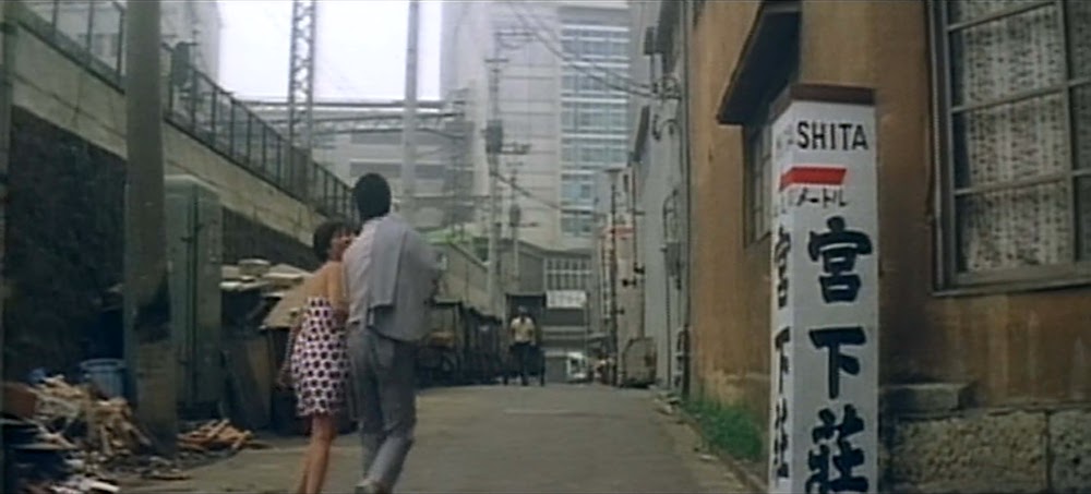 左は山手線。右側は現「片倉コープアグリ株式会社渋谷ビル」(神南1-23-14)。右端の「宮下荘」の看板は同名のアパートが付近になくロケのため設置したものと推定。